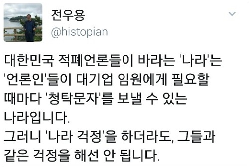 한편, 전우용 역사학자는 이번 사태와 관련해 “대한민국 적폐언론들이 바라는 ‘나라’는 ‘언론인’들이 대기업 임원에게 필요할 때마다 ‘청탁문자’를 보낼 수 있는 나라”라며 “그러니 ‘나라 걱정’을 하더라도, 그들과 같은 걱정을 해선 안 된다”고 힐난했다.