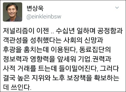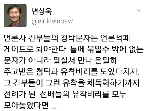 변 대기자는 13일 트위터를 통해 “틀에 묶일 수밖에 없는 문자가 아니라 밀실서 만나 은밀히 주고받은 청탁과 유착비리를 모았다 치자”며 “그 간부들이 그런 유착을 체득화 하기까지 선례가 된 선배들의 유착비리를 모두 모아놓았다면”이라고 가정하며 이같이 말했다.