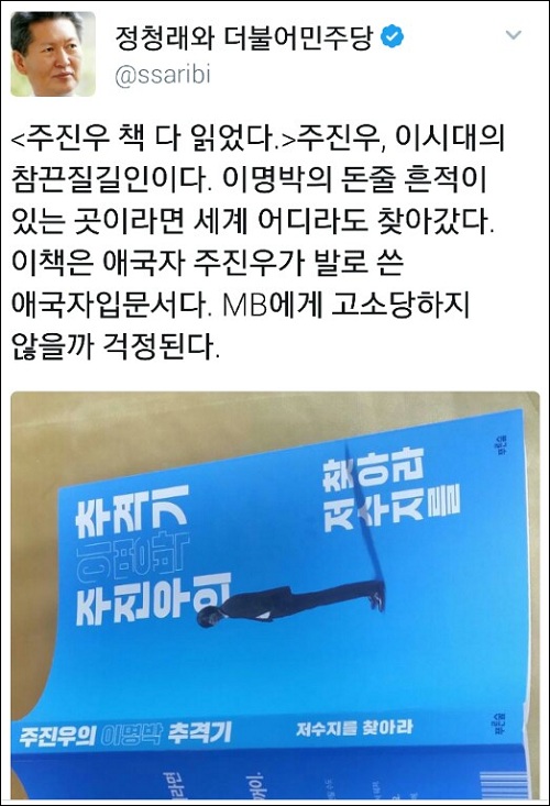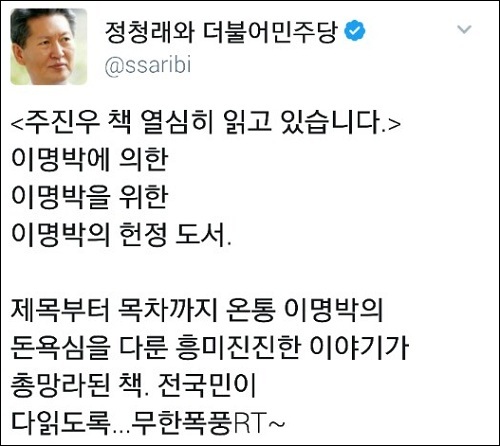 한편, 이런 가운데 정청래 전 의원은 SNS상에서 ‘주진우의 이명박 추격기’ 책 홍보에 적극 나서고 있다.