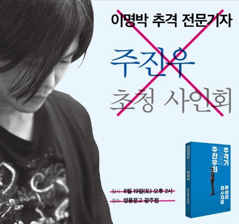신간 ‘주진우의 이명박 추격기’를 펴낸 <시사인> 주진우 기자가 자신의 사인회가 갑자기 취소됐다는 소식을 SNS를 통해 전했다. ‘주진우의 이명박 추격기’는 이 전 대통령의 비자금을 추적한 과정을 다룬 책이다.