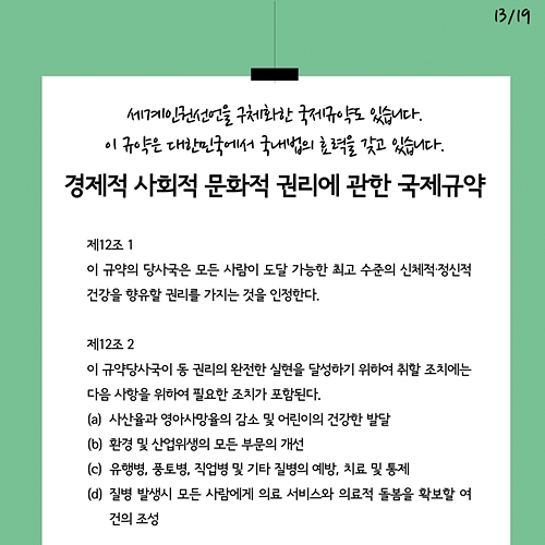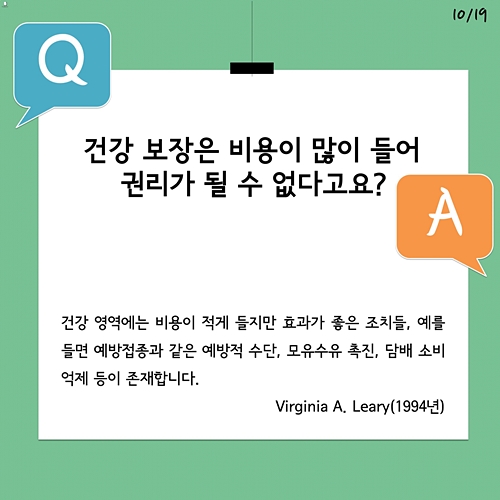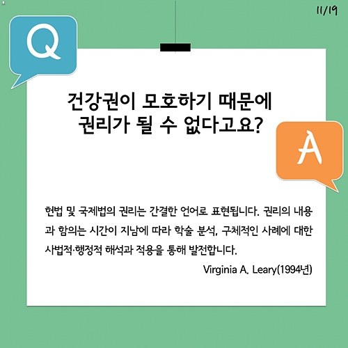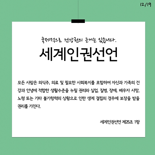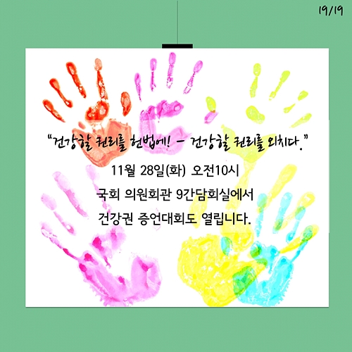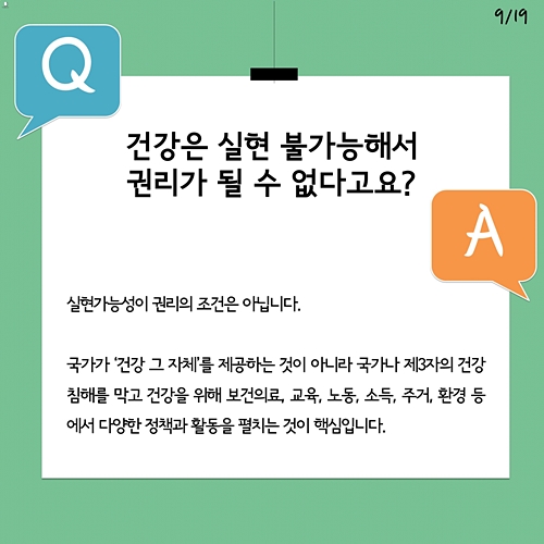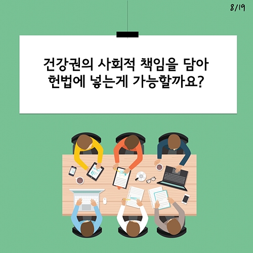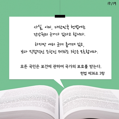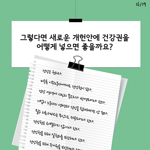 | 건강이란 무엇일까요? 건강의 학술적 개념은 질병∙재해로부터의 자유, 건강과 불건강의 연속, 기능과 잠재역량, 대처능력, 인간의 온전한 상태, 안녕 상태, 질적 삶, 사회적 구성물 등 무척 다양합니다. 학술적 개념이 아닌 일반 시민의 관점에서 보면 어떨까요? 2013년 서울시민회의에서 나온 건강의 개념을 보면 ‘우리에게 건강은 생명과 같음’, ‘건강은 신체적, 정신적’, ‘사회관계적 건강을 아우름’, ‘건강은 봄에 싹이 트고 잎이 무성하고 단풍 들고 낙엽이 져서 떨어지는 나무와 같음’ 등 참 창의적이고 다양합니다. 그렇다면 건강하려면 어떻게 해야할까요? 잘 먹고 잘 자고 운동도 적당히 하고 스트레스 받지 않으면 건강하지 않을까요? 맞습니다. 그러나 현실은 그러기 쉽지 않습니다. 열악한 주거환경, 산업재해, 비싼 진료비, 미세먼지, 가습기 살균제, 살충제 달걀 등 건강에 영향을 미치는 요인은 나이, 유전, 생활습관 같은 개인적 요인 뿐 아니라 교육, 노동, 주거, 의료 등 사회적 요인까지 포함되어 있습니다. 이렇게 복잡한 건강, 과연 헌법에 권리로 명시될 수 있을까요? 건강권 실현하는게 불가능하기 때문에 권리가 될 수 없다? 건강을 실현하는 것은 불가능하기 때문에 권리가 될 수 없다는 말이 있습니다. 그러나 실현가능성이 권리의 조건이라면 ‘차별금지’, ‘의사표현의 자유’, ‘이동과 거주의 자유’, ‘양심의 자유’, ‘공정한 재판을 받을 권리’, ‘노동의 권리’ 등도 권리로서 가능하지 않습니다. 노동권을 위해 정부가 노동 그 자체를 제공하는 것이 아니라 노동을 위한 환경과 조건을 보장해야 하는 것처럼, 건강권 역시 정부가 건강 그 자체를 제공하는 것이 아니라 건강을 위해 보건의료를 포함하여 교육, 노동, 소득, 주거, 환경 등에서 다양한 정책과 활동을 펼쳐야 합니다. 건강권은 비용이 너무 많이 든다? 비용이 엄청나기 때문에 권리로서 불가능하다면, ‘신체의 자유’, ‘공정한 재판을 받을 권리’, ‘선거권’ 등도 권리로서 불가능합니다. 경찰제도, 사법제도, 선거관리 등의 비용도 만만치 않기 때문입니다. 무엇보다 헌법상 의료에 대한 권리가 규정된 핀란드와 규정되지 않은 미국의 보건의료 지출 비용을 비교해보면, 헌법에 의료에 대한 권리가 규정되어 있다고 해서 비용이 더 많이 든다는 것은 사실이 아님을 알 수 있습니다. 참고로 비용이 훨씬 많이 든 미국 보다 핀란드가 건강 수준이 높다는 것도 알 수 있습니다. 건강이 권리? 대한민국 헌법에 근거가 있습니다. 우선 1948년 7월 17일 대한민국 제헌헌법의 경우 제20조에 건강에 대한 내용이 포함되어 있었습니다. “제20조 혼인은 남녀동권을 기본으로 하며 혼인의 순결과 가족의 건강은 국가의 특별한 보호를 받는다.” (1948년) 헌법 제20조는 이후 다음과 같이 변화해 왔습니다. - 제31조 모든 국민은 혼인의 순결과 보건에 관하여 국가의 보호를 받는다. (1962년) - 제34조 제2항 모든 국민은 보건에 관하여 국가의 보호를 받는다. (1980년) - 제36조 제3항 모든 국민은 보건에 관하여 국가의 보호를 받는다. (1987년 - 현재) 국제법에도 근거가 있습니다. 1948년 12월 10일 세계인권선언에는 건강과 관련하여 다음 내용이 포함되어 있습니다. 제25조 1. 모든 사람은 의식주 , 의료 및 필요한 사회복지를 포함하여 자신과 가족의 건강과 안녕에 적합한 생활수준을 누릴 권리와 , 실업 , 질병 , 장애 , 배우자 사망, 노령 또는 기타 불가항력의 상황으로 인한 생계 결핍의 경우에 보장을 받을 권리를 가진다. 세계인권선언을 구체화한 1966년 경제적, 사회적, 및 문화적 권리에 관한 국제규약(대한민국에는 1990년 국내법적 효력 발생)에도 건강과 관련한 내용이 포함되어 있습니다. 제12조 1. 이 규약의 당사국은 모든 사람이 도달 가능한 최고 수준의 신체적정신적 건강을 향유할 권리를 가지는 것을 인정한다. 2. 이 규약당사국이 동 권리의 완전한 실현을 달성하기 위하여 취할 조치에는 다음 사항을 위하여 필요한 조치가 포함된다. (a) 사산율과 유아사망율의 감소 및 어린이의 건강한 발육 (b) 환경 및 산업위생의 모든 부분의 개선 (c) 전염병, 풍토병, 직업병 및 기타 질병의 예방, 치료 및 통제 (d) 질병 발생시 모든 사람에게 의료와 간호를 확보할 여건의 조성 헌법에 건강권을 넣자! 헌법에 건강권을 규정하는 것은 어떤 의미가 있을까요? 첫 번째는 건강권을 국민의 기본권으로 명시, 국가 의무 부담할 수 있습니다. 두 번째로는 헌법의 건강권 조항에 근거해 보건의료기본법, 국민건강증진법 등의 여러 법률이 제정되고 시행될 수 있습니다. 마지막으로 건강권 침해시 헌법재판을 통해 구제가 가능해지고 동시에 건강권 개념이 명확해 집니다. 이미 대한민국 헌법에는 건강권의 근거가 있습니다. 그러나 여러 군데 흩어져 있고 기존 건강권을 담은 제36조 3항 “모든 국민은 보건에 관하여 국가의 보호를 받는다” 는 상당히 모호합니다. 건강과 관련되지 않은 사람은 아무도 없습니다. 따라서 헌법에 들어갈 건강권 조항을 직접 만들어 보는 것은 큰 의미가 있습니다. 다양한 이야기가 가능합니다. 예를 들자면 “건강은 권리다.” 