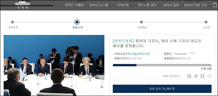 또한 ‘한중 정상회담’ 이후 게재 돼 지금까지 진행 중인 ‘청와대 기자단, 해외 수행 기자단 제도 폐지 청원’에는 21일 현재 73,797명이 서명했다.
