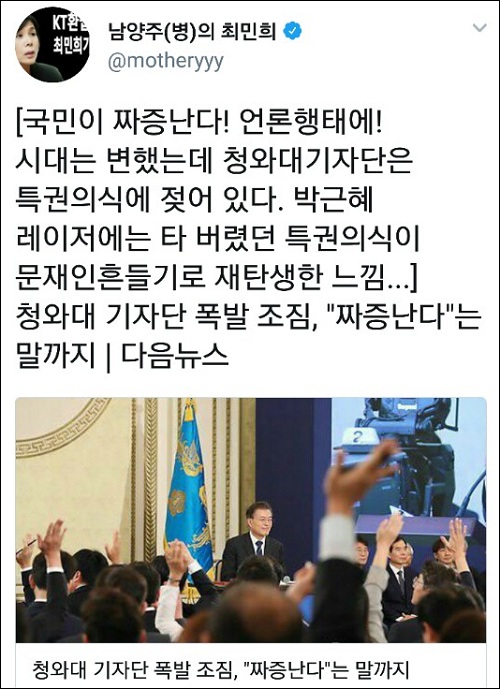 최민희 전 더불어민주당 의원은 ‘언론 행태에 국민이 짜증난다’며 “시대는 변했는데 청와대기자단은 특권의식에 젖어 있다. 박근혜 레이저에는 타 버렸던 특권의식이 문재인 흔들기로 재탄생한 느낌”이라고 비판했다.