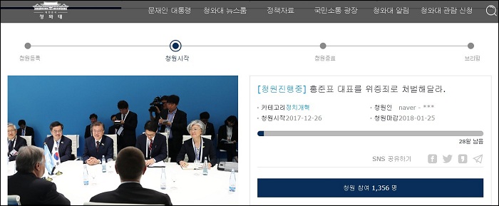 청원자는 해당 게시글을 통해 “이번 홍준표 대표의 재판 결과를 지켜보면서 많은 국민들은 실망을 하고 탄식했을 것”이라며 “2심과 대법원에서 (홍 대표에)무죄로 판결했다는 것을 국민들은 납득할 수 없다”고 밝혔다.