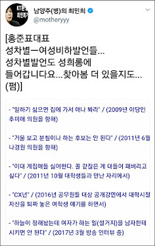 그러나 홍 대표는 그간 숱한 여성비하 발언으로 인권 감수성이 결여된 것 아니냐는 비판을 받아왔다.