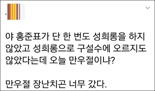 SNS에서는 “발정제까지 책에 담아놓고 어찌 그런 말을 뻔뻔하게 할 수 있는지 대단하다”(with*******), “지는 성희롱 발언이 아니라고 생각하고 내뱉겠지, 진짜 싫다”(not******), “입만 열면 거짓말하는 홍준표”(drkp*****), “아무 말도 안한다는 건 그 말이 맞다라는 뜻인데 그럼 자유당 여성의원들은 밤에만 쓰이나 보네”(sai*****) “자유한국당 여성의원들은 홍준표 ‘여성을 밤에만....’ 여성 비하를 수긍한다는 것인가”(ts7***) 등의 의견이 이어졌다.