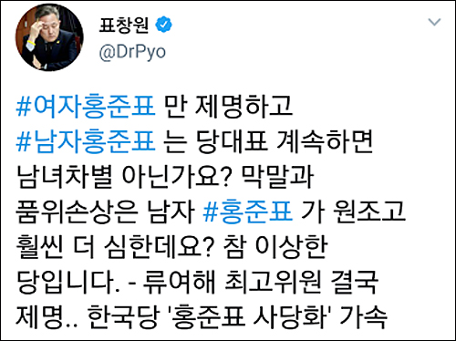 표창원 더불어민주당 의원은 소셜미디어를 통해 “여자 홍준표만 제명하고 남자 홍준표는 당대표를 계속하면 남녀 차별 아닌가요”라고 지적했다.