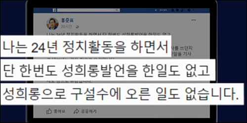 이에 대해 홍 대표는 같은 날 페이스북에서 “나는 24년 정치활동을 하면서 단 한 번도 성희롱 발언을 한 일도 없고 성희롱으로 구설수에 오른 일도 없다”고 항변했다.