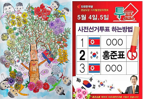 자유한국당 경남도당은 지난해 5월 2일 사전선거 투표에서 홍준표 후보를 지지해달라며 페이스북에 올린 투표용지 형태의 홍보물에서 1번과 3번에 북한 인공기를 그려 넣었다.