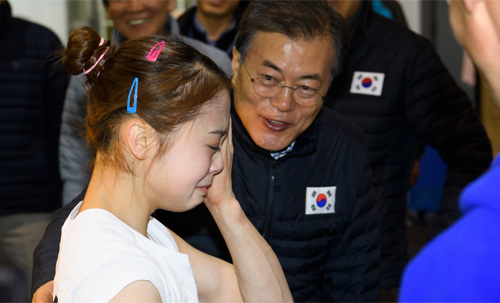 특히 문 대통령은 여자기계체조실을 방문하던 중 이은주 선수가 고된 훈련에 힘들어하며 눈물을 흘리자 손수건을 직접 꺼내 눈물을 닦아주며 격려했다.