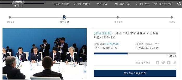 한편, 나 의원을 평창올림픽 조직위원직에서 파면해달라는 청와대 국민청원은 최단기간인 나흘 만에 청와대가 공식입장을 내놔야 하는 20만 명을 달성했고, 1일 오후 4시 현재는 청원 참여자가 30만 명에 육박한다.