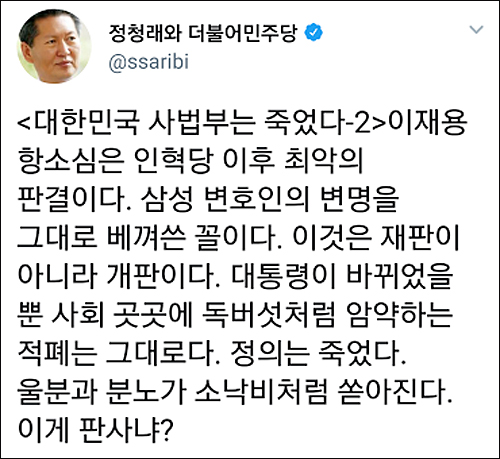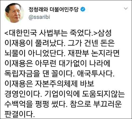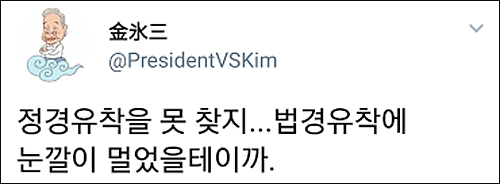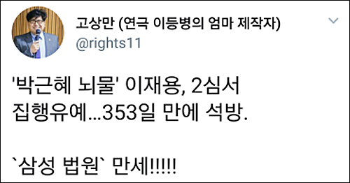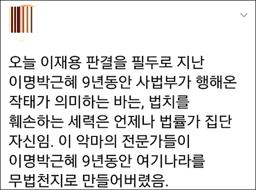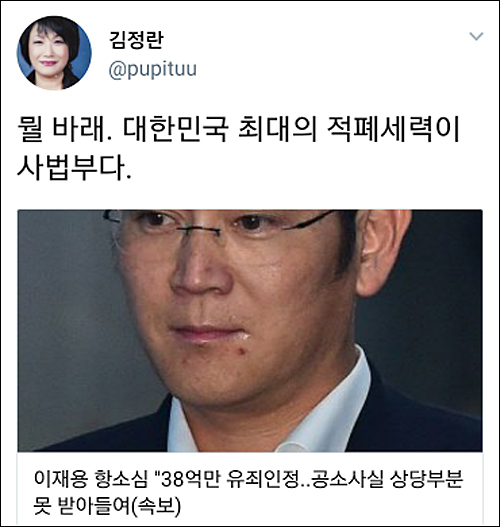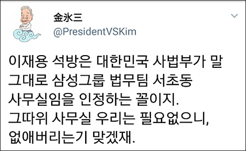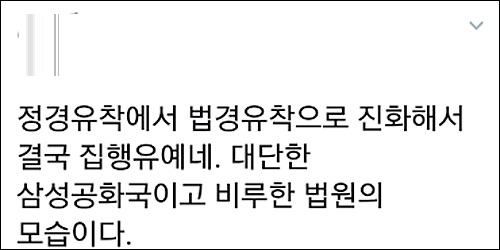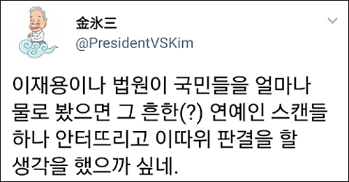 그런가 하면 유명 트위터리안 ‘김빙삼’(金氷三 @PresidentVSKim)은 “이재용이나 법원이 국민들을 얼마나 물로 봤으면 그 흔한(?) 연예인 스캔들 하나 안터뜨리고 이따위 판결을 할 생각을 했으까 싶네”라고 비꼬았다.