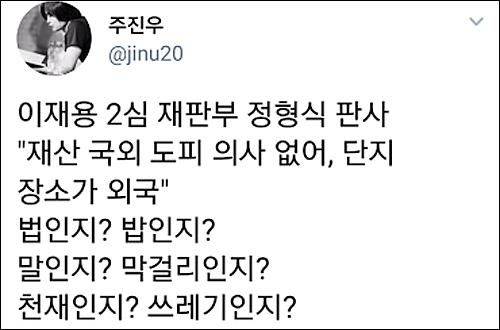 주진우 시사인 기자는 “정형식 판사 ‘재산 국외 도피 의사 없어, 단지 장소가 외국’ 법인지? 밥인지? 말인지? 막걸리인지? 천재인지? 쓰레기인지?”라고 비난했다.