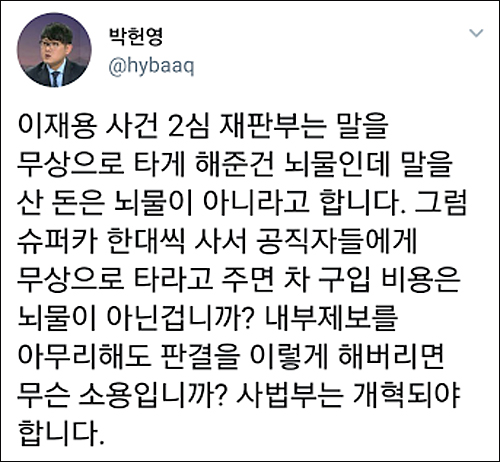 국정농단 사태 내부고발자 박헌영 전 K스포츠재단 과장은 SNS에서 “이재용 사건 2심 재판부는 말을 무상으로 타게 해준 건 뇌물인데 말을 산 돈은 뇌물이 아니라고 한다”며 “그럼 슈퍼카 한대씩 사서 공직자들에게 무상으로 타라고 주면 차 구입 비용은 뇌물이 아닌 것인가”라고 비판했다.