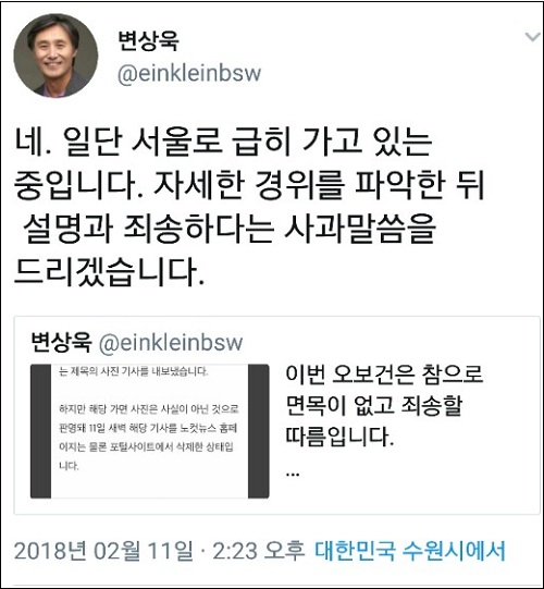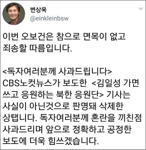 ‘오보’ 논란 이후 변상욱 대기자는 자신의 SNS를 통해서도 “평창올림픽을 계기로 남북관계가 새로운 돌파구를 마련하려는 시점에 이런 큰 실수를 저지르고 정쟁에 이용되어 파문이 커지고 보니 정말 무어라 드릴 말씀이 없다”고 밝혔다.