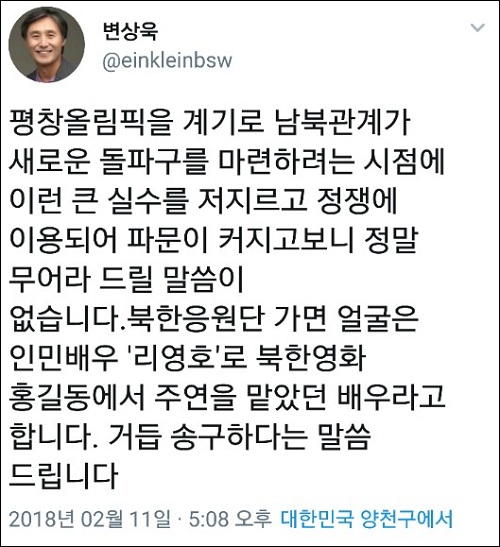 이어 “북한응원단 가면 얼굴은 인민배우 ‘리영호’로 북한 영화 홍길동에서 주연을 맡았던 배우라고 한다”며 “거듭 송구하다는 말씀을 드린다”고 덧붙였다.