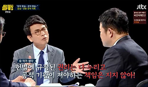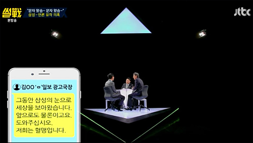 유시민 작가와 박형준 동아대학교 교수는 15일 JTBC ‘썰전’에서 삼성과 언론의 낯뜨거운 유착관계를 보여주는 장충기 전 삼성그룹 사장(미래전략실 차장)의 문자에 대해 다뤘다.