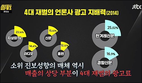2014년 경제개혁연구소가 분석한 ‘4대 재벌의 언론사 광고지배력’에 따르면 4대 개벌의 광고 시장 점유율이 지상파TV 23.56%, 신문 15.02%, 라디오 14.47%, 종편 12.32%로 나타났다.
