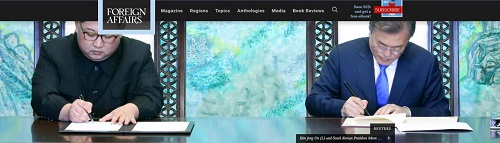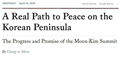 미국의 외교전문지 포린어페어스에 4월 30일 한국의 대통령 통일외교안보특보인 문정인 특보의 기고문이 실렸다. 문정인 특보는 기고문에서, 자신이 참석한 세 번의 남북한 정상회담(2000, 2007, 2018) 중 이번회담은 다를 것이라고 말하면서, 문재인 대통령과 김정은 위원장 두 사람은 판문점 공동선언문을 통해 “한반도에서 전쟁은 더 이상 없을 것이며 따라서 새로운 평화의 시대가 시작되었다”고 확약함과 동시에 상당히 높은 수준의 약속을 주고받았다고 말했다.