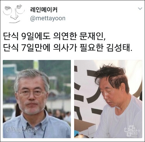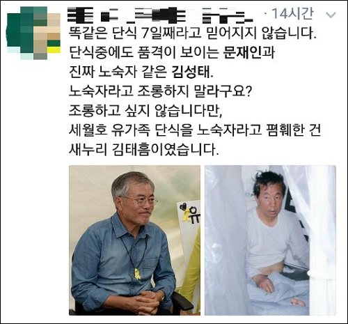 그는 “유민아빠(김영오 씨)까지 갈 필요도 없이 같은 정치인 문재인 의원의 동조 단식 당시 언론은 ‘문재인 자가당착’, ‘문재인 단식 중단해야 돼’, ‘문재인 단식, 당이 위기인데 뭇매’, ‘딱한 문재인’, ‘문재인 단식 갈등 조장’ 이렇게 보도했다”며 “건강 걱정은 전혀 없다”고 되짚었다.