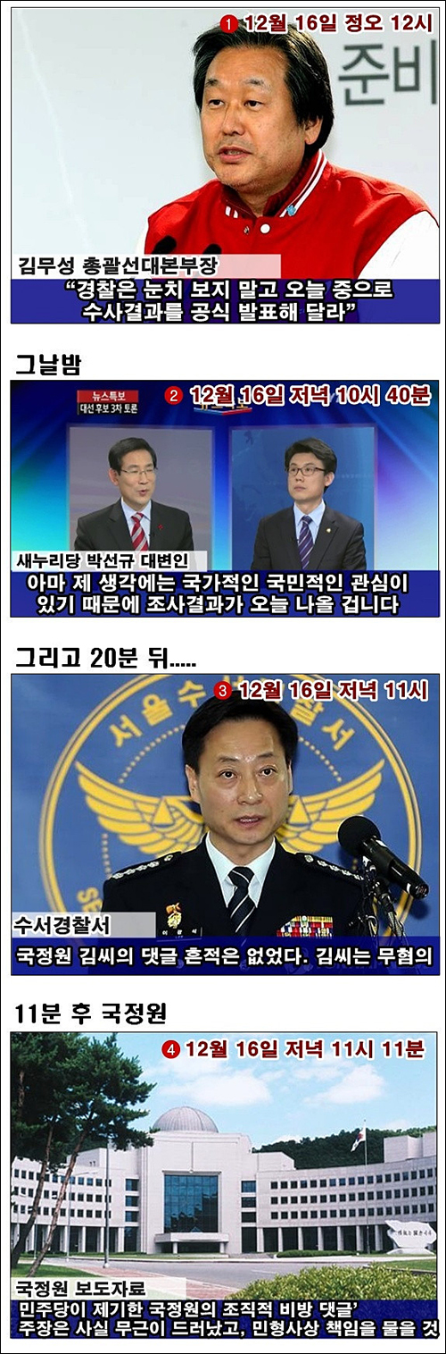 이어 3차 토론회 끝난 직후인 밤 11시 경찰이 수사발표를 했으며 경찰 수사 발표 직후 11분만에 국정원은 보도자료를 배포했다. 이같은 당시 상황을 알기 쉽게 ‘국정원 짤’로 정리한 것이다.