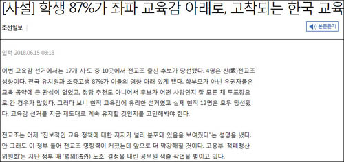 “지금 좌파 교육감들이 기세를 떨치는 교육계는 치열한 세계 경쟁을 돌파해나갈 인적 자원의 양성에는 관심이 없다 … 한국 교육계는 완전히 친전교조 세력에 의해 장악됐고 선거에 의해 구조적으로 고착되고 있다. 이게 한국 교육의 미래다.” (조선일보 6월15일자 사설)