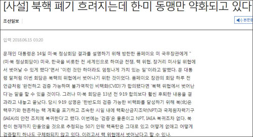 “북핵을 없애 한국의 안보를 지키고자 시작한 협상이, 북핵 폐기는 모호하고 불확실한 지대로 들어가고 한·미 동맹은 명백히 약화되는 결과를 낳고 있다. 지금 모두가 북한 체제 안전을 걱정하는데 정작 한국민 안위는 누가 대변하고 있나.” (조선일보 6월15일자 사설)