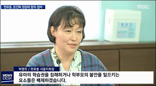 “한유총 중앙비대위원을 비롯한 강경파 15명이 한유총 서울지회 사무실을 찾아와 집단 폐원에 동참할 것을 압박했습니다. 박(영란) 지회장은 강한 항의를 받았고 이 과정에서 갑자기 쓰러져 119 호송차를 통해 병원에 입원했습니다. 입원 뒤에도 경찰에 신변보호까지 요청했습니다. 유치원 원장 10여명이 지속적으로 항의 문자를 보내면서 찾아오겠다고 협박까지 하고 있다는 이유였습니다. 이에 대해 현장에 있었던 강경파 임원들은 신체적 접촉은 전혀 없었고, 박 지회장이 자리를 뜨던 도중 갑자기 혼자 넘어졌다고 주장했습니다.” (MBC ‘뉴스데스크’ 2018년 12월2일)