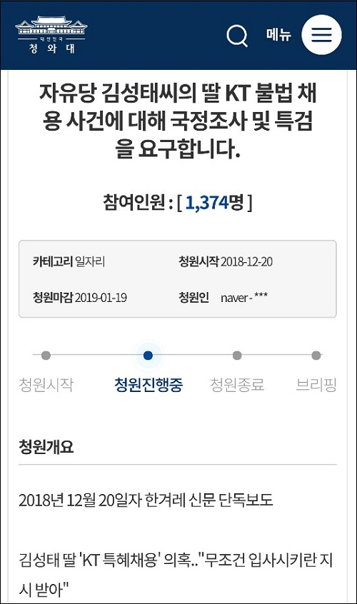 청와대 국민청원도 올라온 상태다. 청원자는 <한겨레> 보도를 언급하며 “복수의 관계자가 김성태 씨의 딸 채용에 불법과 부정이 개입되었다고 기사에서는 말하고 있다. 대한민국 주권자로서 자유당 권력형 채용비리 범죄에 대해 국정 조사 및 특검을 요구한다”고 밝혔다.