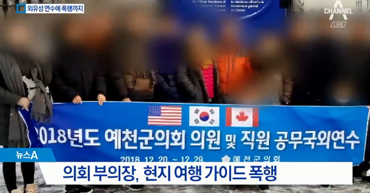 “경북 예천군의회 부의장이 외국 연수 중에 현지 가이드를 폭행해 물의를 빚고 있다. 4일 예천군의회 등에 따르면 군의원 9명과 의회사무국 직원 5명은 지난해 12월 20일부터 7박 10일간 미국 동부와 캐나다로 연수를 다녀왔다. 전체 비용은 6천100만원이다.”