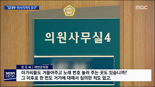 이날 MBC에 따르면, 권 의원은 미국 도착 이튿날 바로 여성 접대부가 있는 술집으로 데려가 달라고 요청했다. 이에 대해 권 의원은 “아가씨들도 거들어주고 노래 번호 눌러 주는 곳도 있습니까? 그 이후로 한 번도 거기에 대해서 질의한 적도 없고”라며 ‘단 한 번’ 질의했다는 사실을 강조했다.