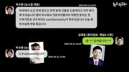 30일 뉴스타파는 <동아일보> 김재호 사장과 박수환 대표가 주고받은 문자 메시지를 공개했다. 해당 문자 메시지에는 김 사장이 박 대표를 통해 의사 처방 없이는 구입이 불가능한 전문의약품을 동아제약으로부터 제공받았다는 내용이 담겨있다.