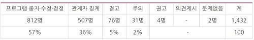 해당 안건에 총 1,432명의 시민들이 심의 의견을 제출했다. 재승인 심사에 벌점이 있는 ‘법정제재’가 1,426명으로 대부분을 차지했고 벌점이 없는 ‘행정지도’가 4명, ‘문제없음’은 2명이다.