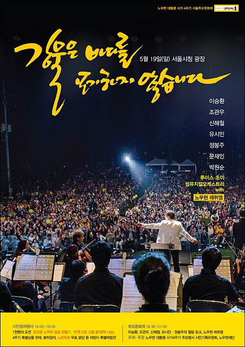 노무현재단은 오는 19일 오후 6시 30분부터 서울시청 앞 광장에서 가수 이승환, 조관우, 신해철씨의 화려한 공연이 펼쳐진다고 8일 밝혔다.