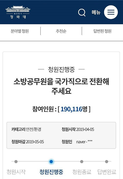 지난 5일 올라온 ‘소방공무원을 국가직으로 전환해주세요’라는 제목의 청와대 국민청원은 8일 오전 11시 20분 현재 19만명을 넘어섰고, 20만 달성을 목전에 두고 있다.