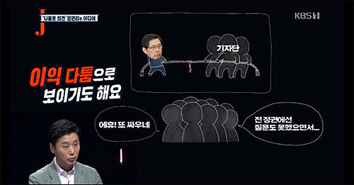 이를 지적하며 정 교수는 “사람들의 일반적인 감정은 법무부 장관 왜 저랬지?라면서도 기자들도 안 예뻐 보이는 것”이라고 했다. 그는 “정말로 기자들이 국민을 대신해 국가와 싸워주고 있다는 마음, 정부에 대해 확실히 비판하는 마음을 가지려면 시간이 흘러야겠구나 라는 생각이 든다”고 했다.
