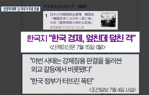 산케이신문은 18일 “청와대 대변인이 기자회견에서 일본의 규제강화를 보도한 기사의 제목을 열거하며 보수계 조선일보와 중앙일보의 이름을 들며 비판했다”고 보도했다.