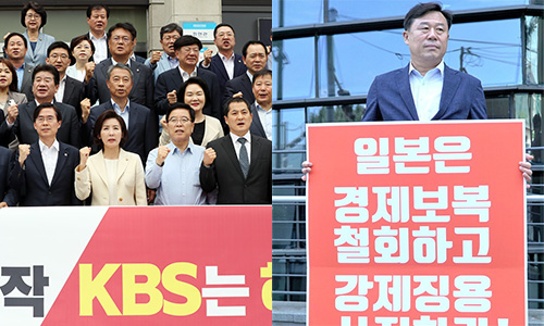 자유한국당이 불매운동 보도 관련 KBS를 강력 규탄하는 가운데 민중당 김종훈 의원은 국회의원들 중 처음으로 일본 대사관 앞에서 1인 시위를 벌였다.