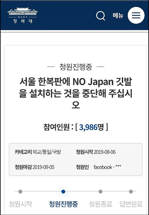 서울 중구청이 일본의 ‘백색국가 제외’ 항의의 뜻으로 6일 밤부터 서울 한복판에 1,100개의 ‘NO Japan’ 배너기를 세운다고 밝혔지만 네티즌들의 반응은 싸늘하다. 청와대 홈페이지에는 ‘NO Japan’기 설치 중단을 요구하는 국민 청원까지 등장했다.