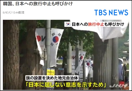 실제로 이날 일본 TBS 방송 계열 JNN은 “일본에 대한 반발이 강해지는 한국에서는 일본인에게 인기 있는 관광지인 명동 등 서울 중심부에 일본제품 불매 운동과 여행 중단을 촉구하는 깃발, 1100개를 설치하는 작업이 시작됐다”고 보도했다.