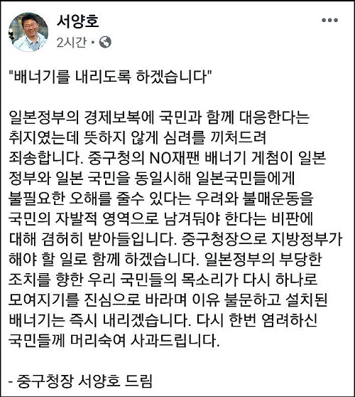 서양호 중구청장은 6일 오후 페이스북을 통해 “배너기를 내리도록 하겠다”면서 “일본 정부의 경제보복에 국민과 함께 대응한다는 취지였는데 뜻하지 않게 심려를 끼쳐드려 죄송하다”고 사과했다.