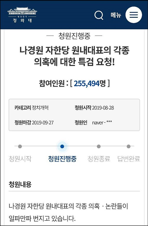 지난달 28일 올라온 해당 청원글 게시자는 “나경원 자한당 원내대표의 각종 의혹‧논란들이 일파만파 번지고 있다”며 이에 대한 특검수사를 요구했다.