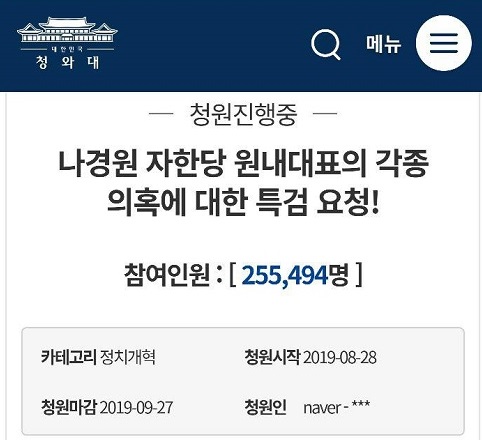 자유한국당 나경원 원내대표 관련 각종 의혹에 대한 특검을 요청하는 청와대 국민청원이 9일 오전 11시20분 현재 25만을 돌파했다.