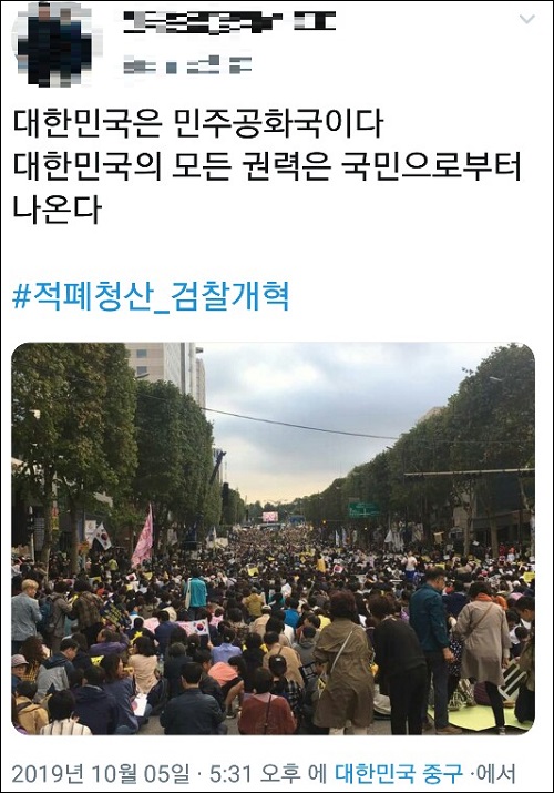 또 트위터 이용자 ‘@park_*****’는 “조국 법무부 장관이 취임한 지 한 달도 안 되어 이뤄진 놀라운 검찰 개혁 진도를 정리했다”고 유튜브 영상 링크를 공유하고는 “이 모든 것이 열심히 서초동에서 또 집에서 함께 검찰개혁과 조국 장관 수호를 위해 애써주시는 촛불 시민의 덕이다. 집회에 나가계신 모든 분들께 응원과 감사드린다”고 전하기도 했다.