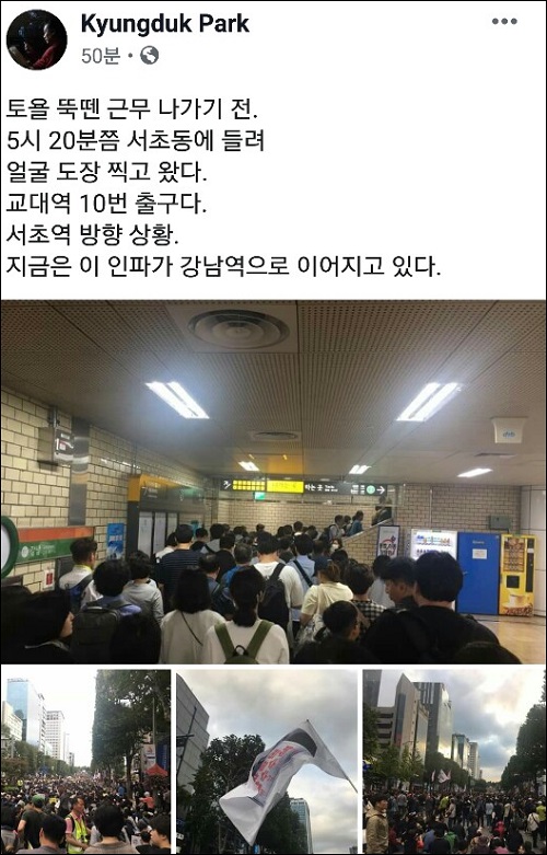 이런 가운데 집회에 참석한 시민들은 트위터와 페이스북 등을 활용해 촛불로 물든 서초동 일대 현장 상황을 실시간으로 공유했다.