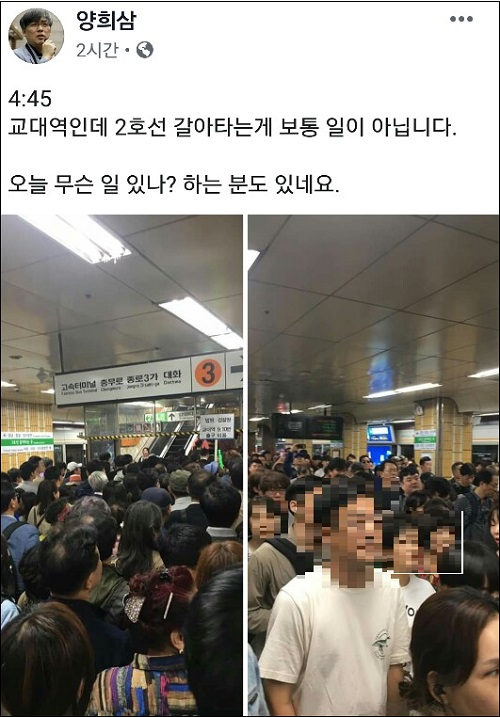 이날 <시사인>은 집회 시작(오후 6시) 30분 전, 페이스북 페이지를 통해 “이미 지난주 촛불집회 규모를 넘어선 듯하다”며 “서초대로 사방으로 시민들이 자리를 잡고 앉았고, 예술의전당 쪽도 모두 차고 있다”고 전했다.