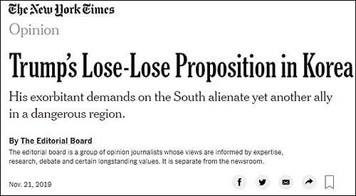 뉴욕타임스는 21일 편집국(The Editorial Board) 명의로 된 ‘Trump’s Lose-Lose Proposition in Korea-한반도에서 트럼프의 루즈-루즈(양자 모두 패자가 되는) 제안’이라는 제목의 사설을 통해 ‘한국에 대한 트럼프의 무리한 요구는 위험지역에서 또 하나의 동맹국을 멀어지게 할 뿐이다’라고 우려를 표시했다.