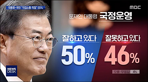 반면, 문재인 대통령의 국정운영에 대해선 ‘잘하고 있다’ 50%, ‘잘못하고 있다’ 46%로 나타났다. MBC는 “이달 초 MBC 조사보다 지지 의견이 2.1%P 올랐습니다”라고 풀이했다. 정당별 지지율도 특기할 만 했다. MBC 리포트를 더 보자.