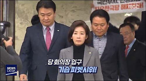 2. 자유당 원내대책회의 중 대학생들이 ‘자유한국당 해체’를 촉구하는 기습시위를 벌였습니다. 학생들의 기습시위에 의원들은 “민주당에 가서 하라” “민주당이 국회 여는 것을 막고 있다” “적당히 하라”며 불편한 내색을 보였습니다.