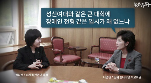 “나 의원이 먼저 말을 꺼내기 전까지 성신여대 내부에서는 장애인 전형 도입과 관련해 어떠한 공식 논의도 없었다. 나경원 의원은 성신여대에 장애인 전형이 없다는 사실을 어떻게 안 걸까? 뉴스타파 취재결과 성신여대에 특강을 하러 가기 열흘 전인 2011년 5월 3일 나경원 의원은 당시 교육과학기술부 특수교육과 김은주 과장과 권택환 장학관을 자신의 사무실로 불렀다.